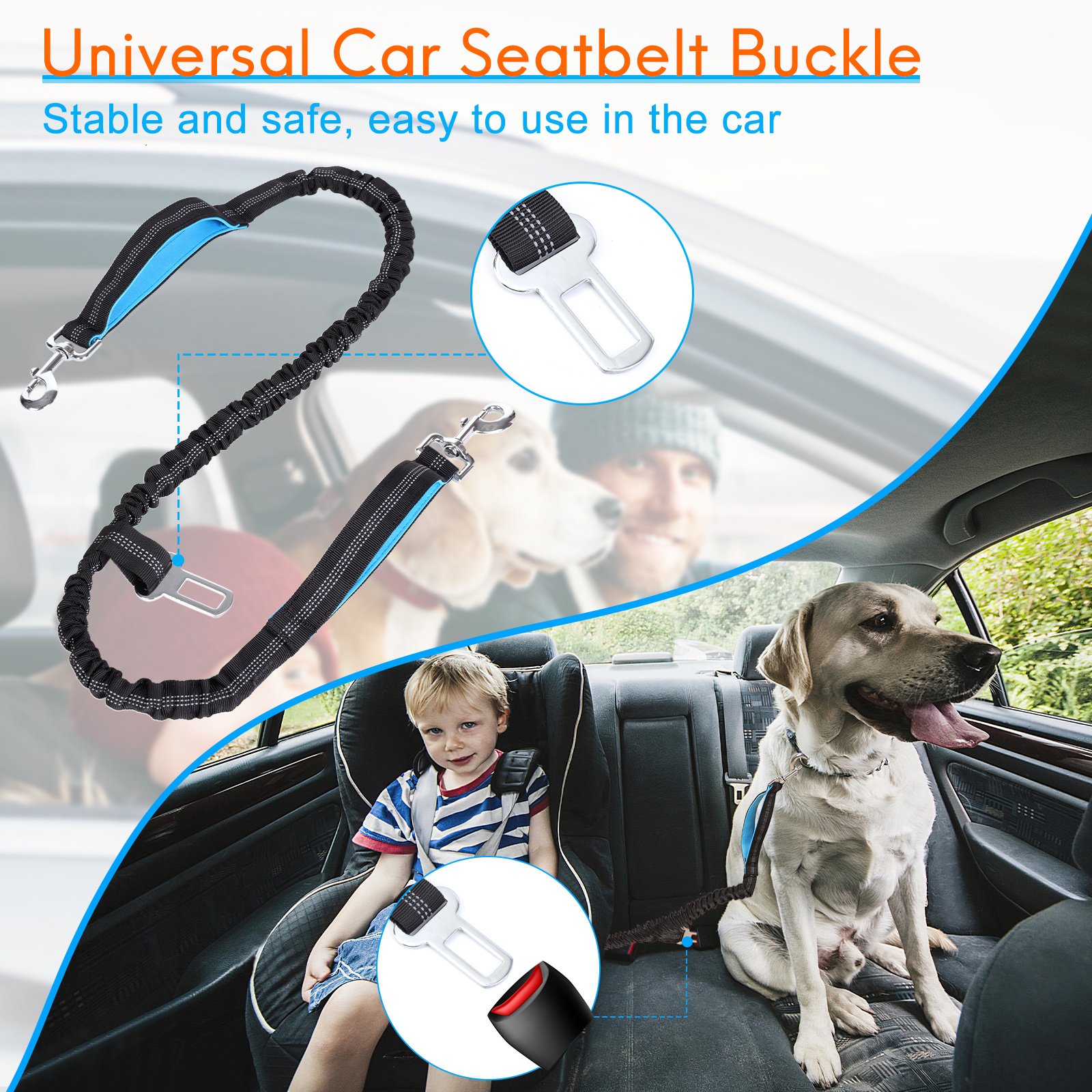 5.Dog safety Seat Latch for Driving,Dog seat belt latch design with elastic bungee ensures the safe travling with your pets and the adjustable distance to allow pets active freely in certain space, providing the most relaxing driving experience for you.